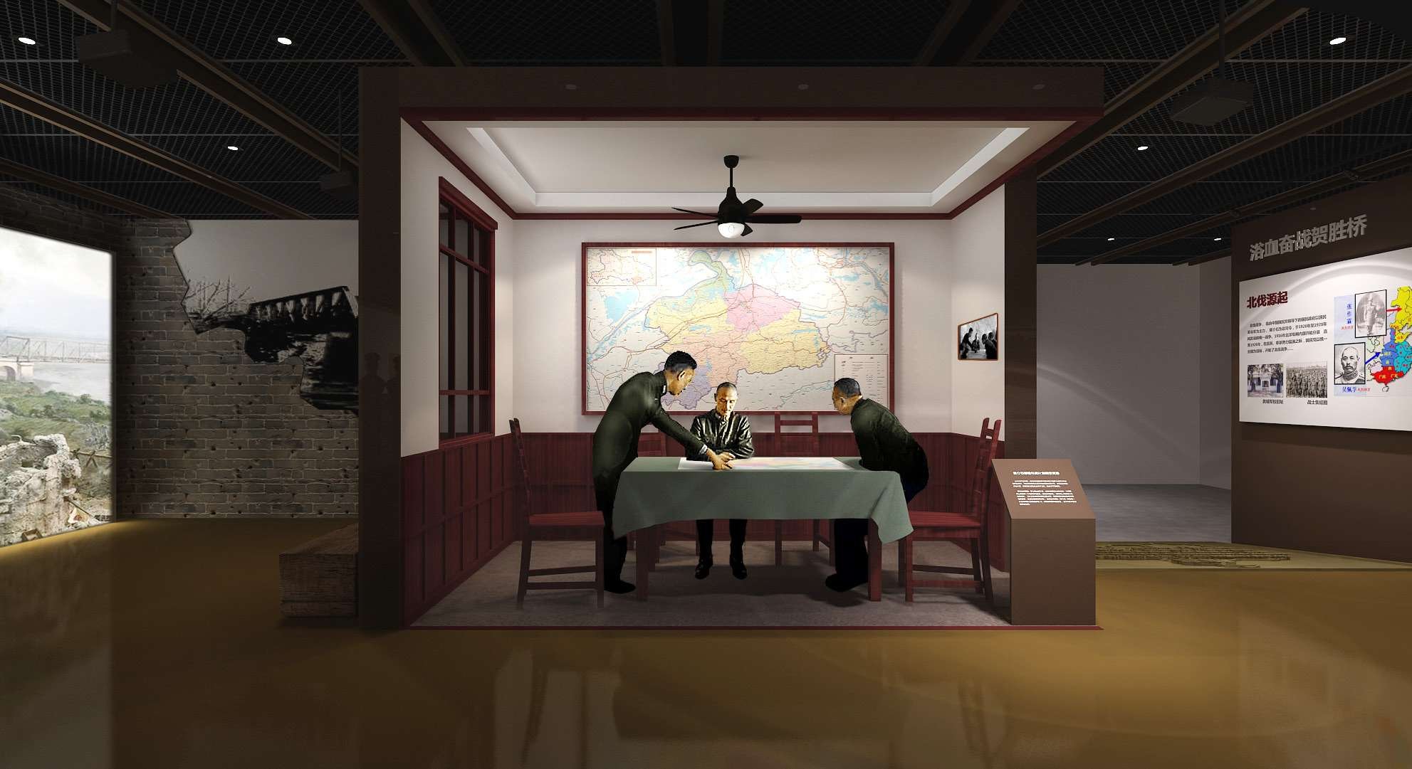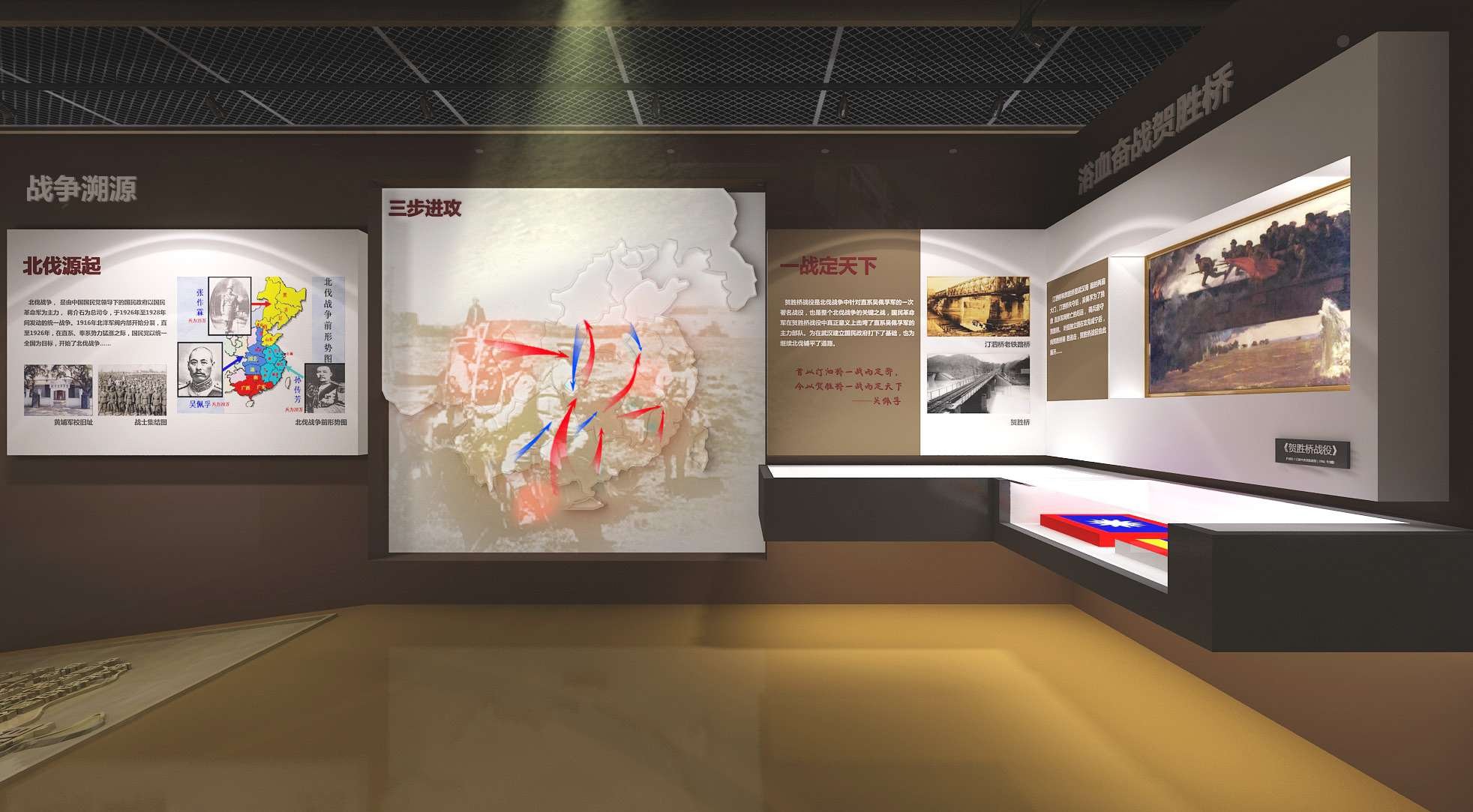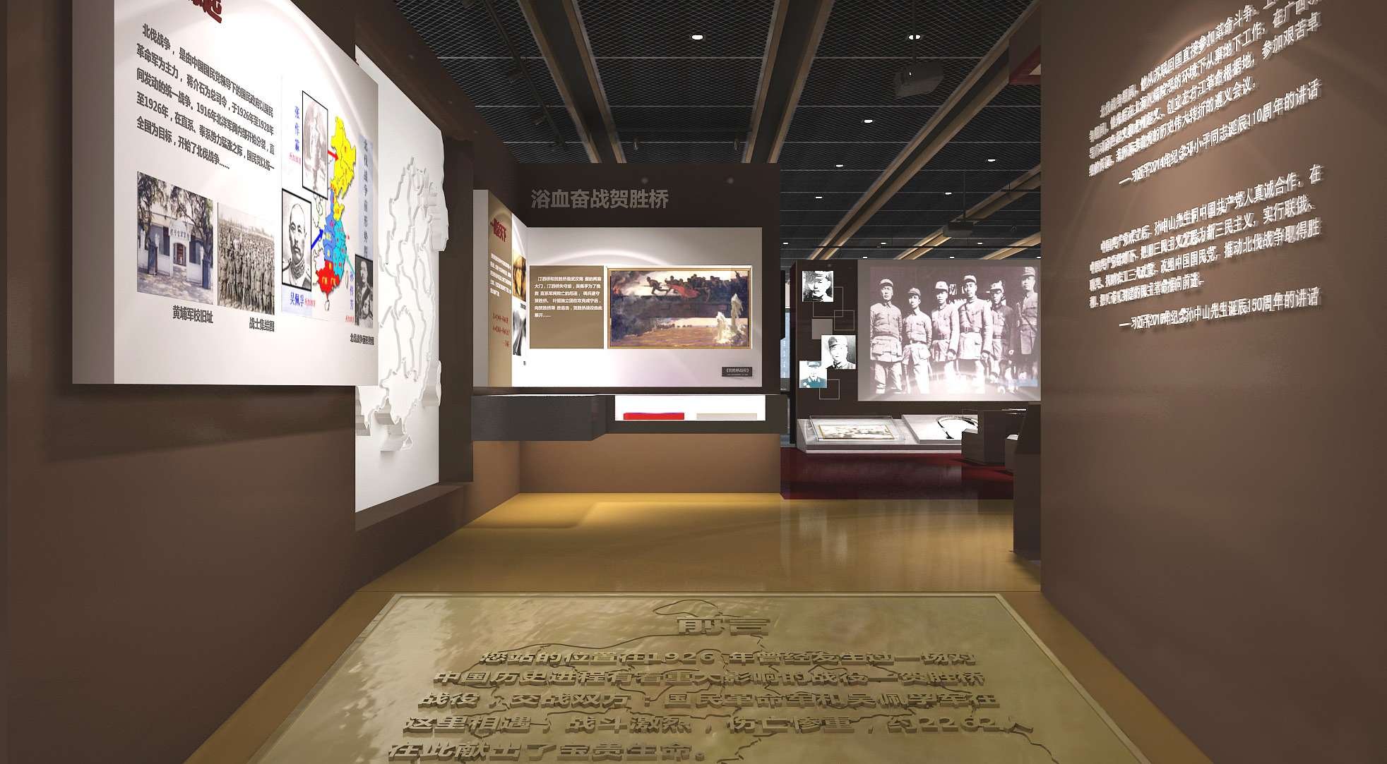 使用展板的形式結合展臺,有效的擴充展示面積。三步進攻使用素模沙盤結合投影的形式演繹戰爭進攻的路線,通過復合形式,講訴賀勝橋戰役整體戰略背景及戰前形式