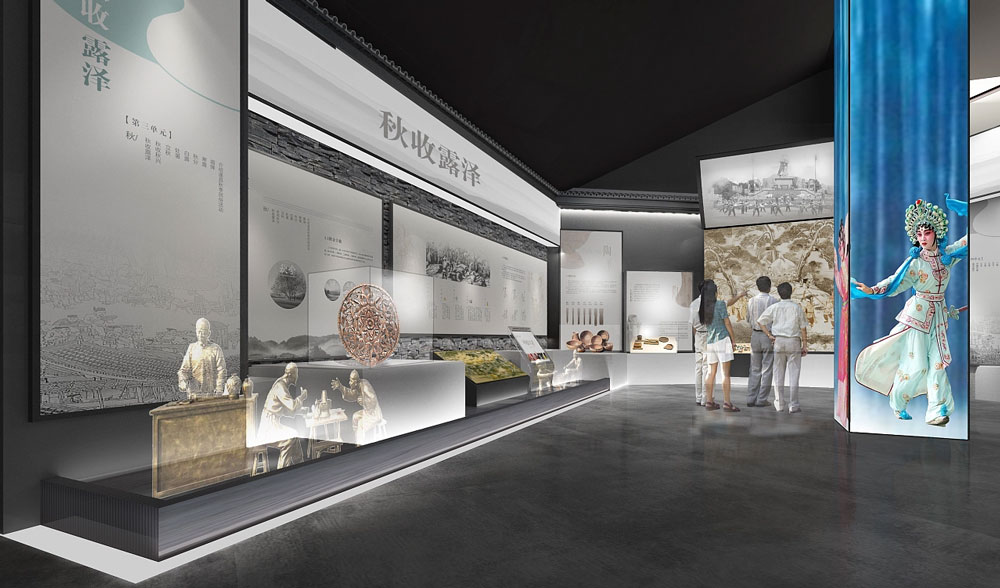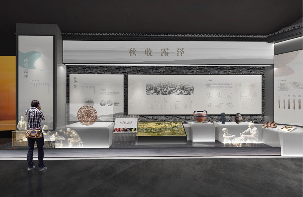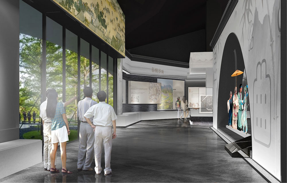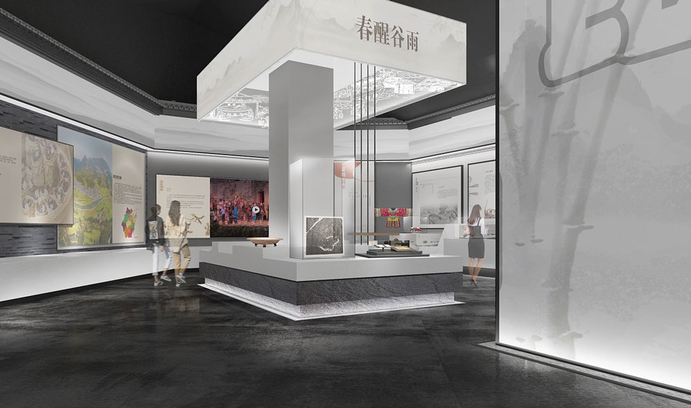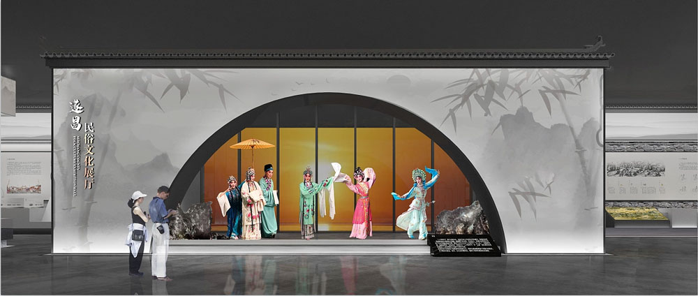 - 設計風格 。該展廳以遂昌當地的民俗文化作為主題,在展廳入口處用半圓形的LED屏播放當地特色戲曲,展示當地優秀的傳統文化,吸引來往觀眾的視線。展廳內部以新中式的風格進行展廳裝修,采用白墻灰瓦的搭配,豐富的圖文墻和顯示屏,以及高科技投影,將傳統文化用現代化的技術和裝備進行展示,使傳統與現代藝術完美融合在一起。
