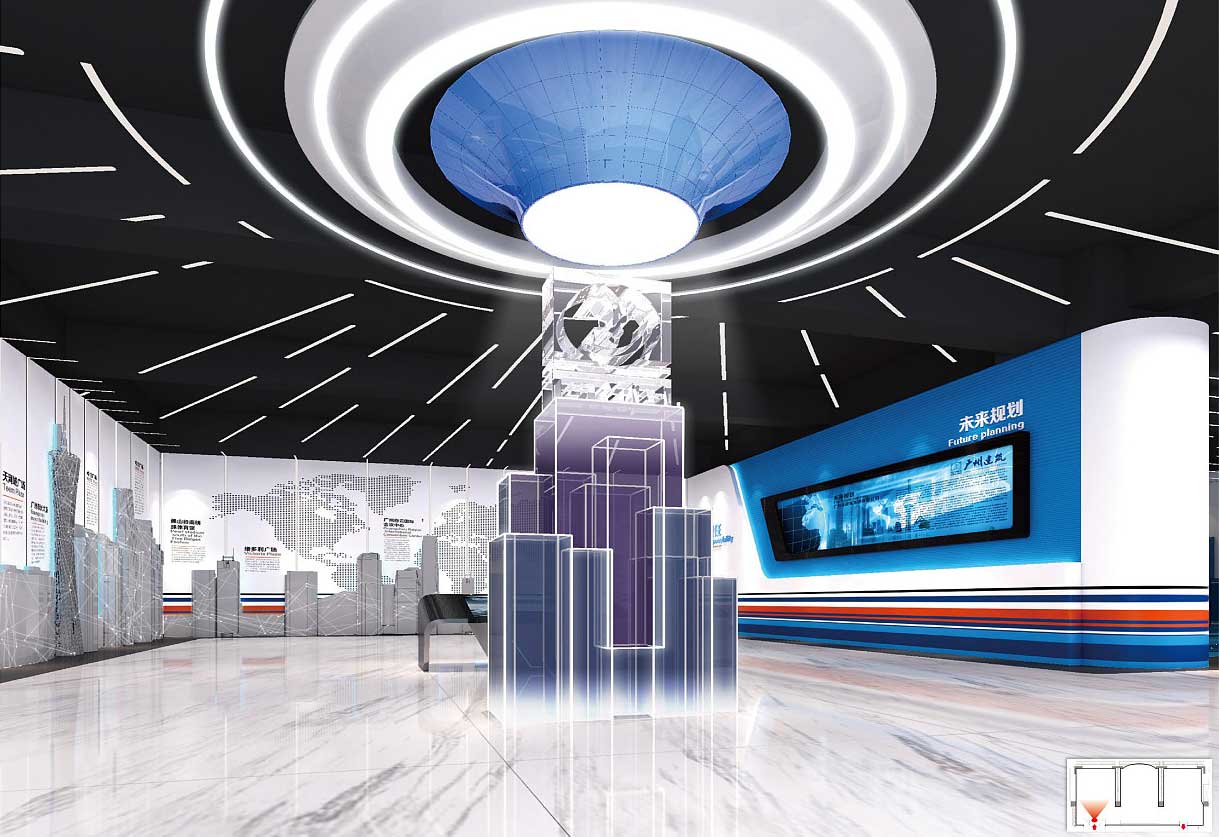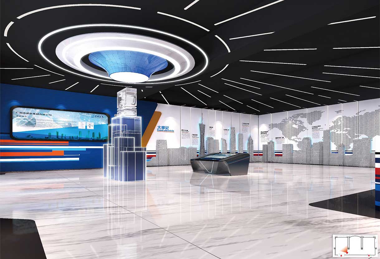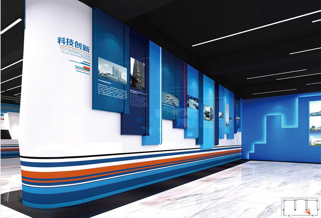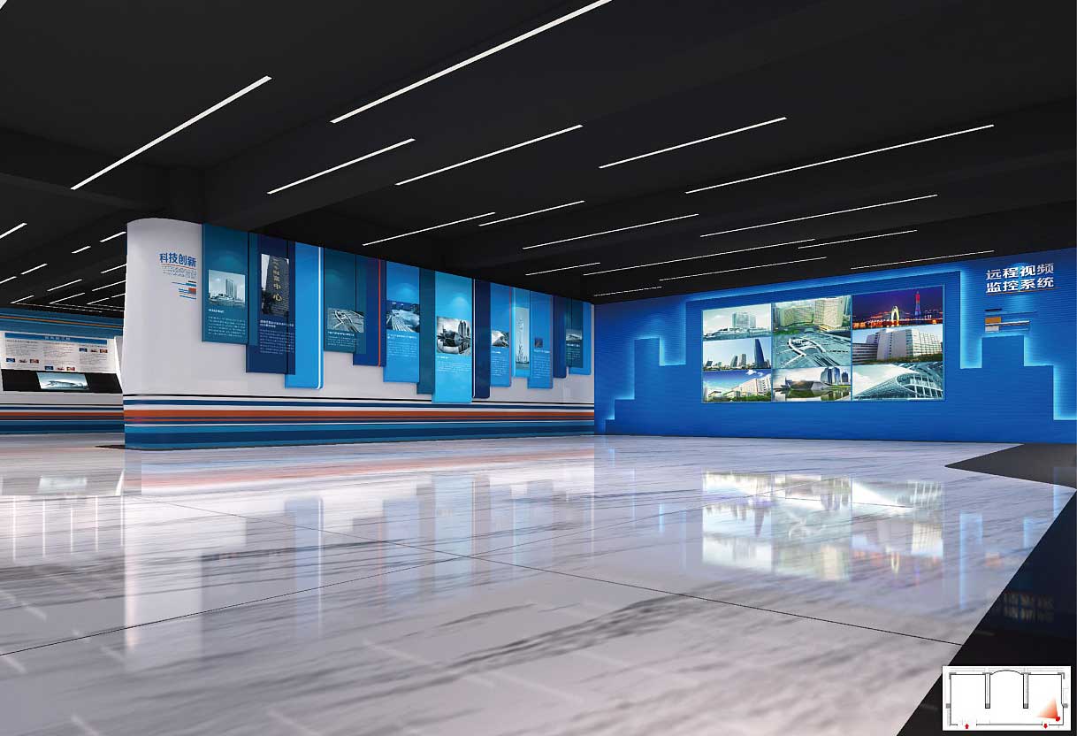 為了彰顯企業的專業性,本次設計將采用墻面投影+互動觸摸屏為主要展示形式,借助更豐富的展示形式,將企業精神充分融入進展示空間之中,強調廣建集團堅持高品質發展戰略的決心。