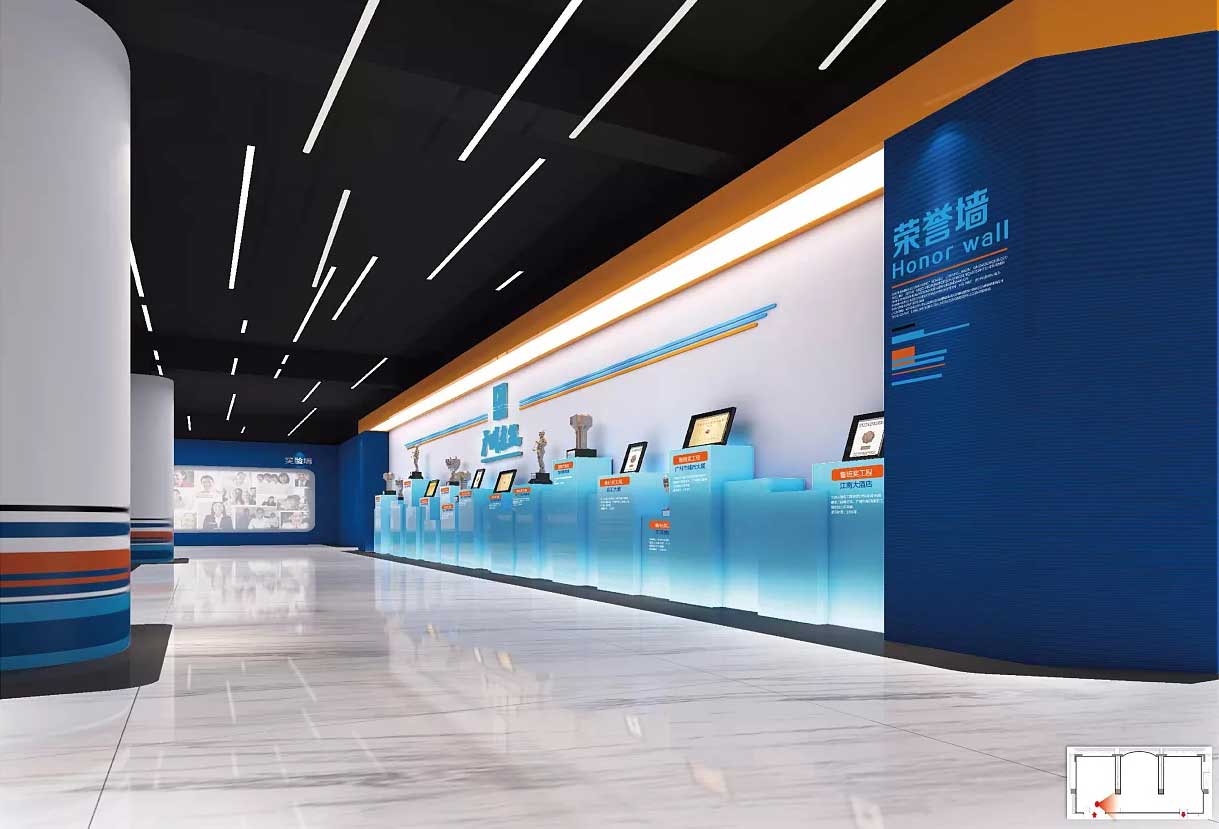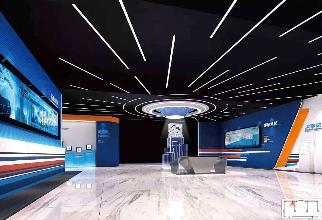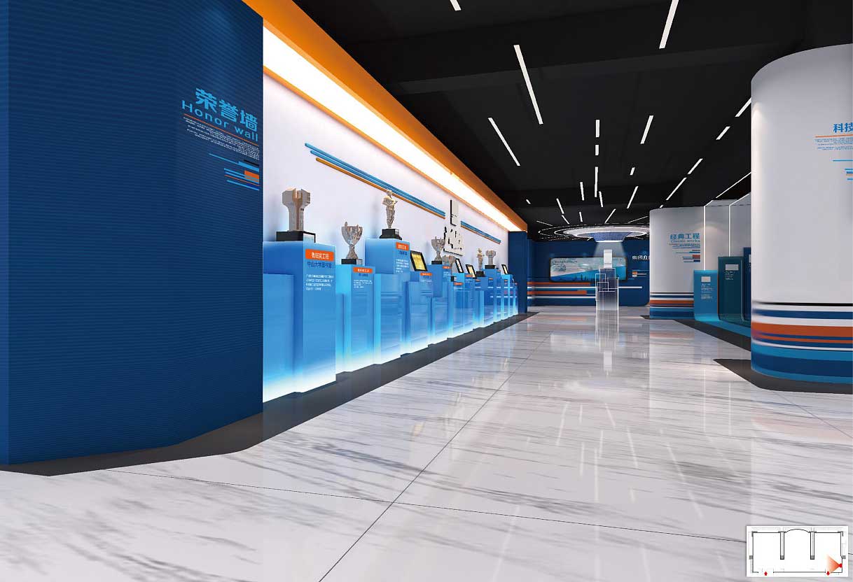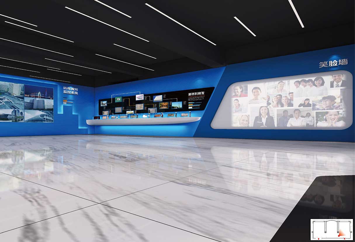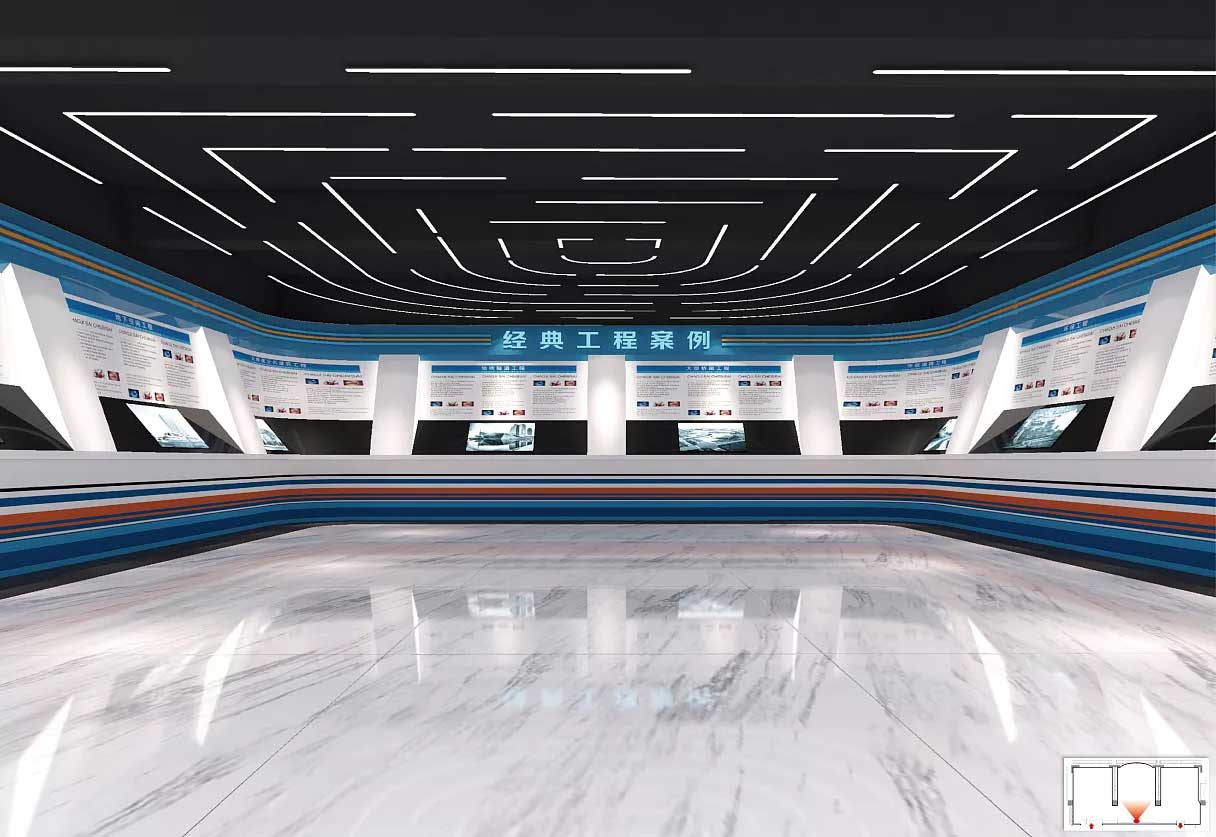 為了彰顯企業的專業性,本次設計將采用墻面投影+互動觸摸屏為主要展示形式,借助更豐富的展示形式,將企業精神充分融入進展示空間之中,強調廣建集團堅持高品質發展戰略的決心。