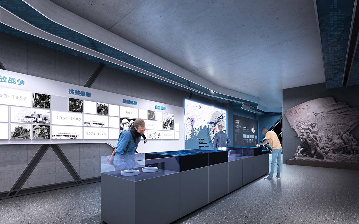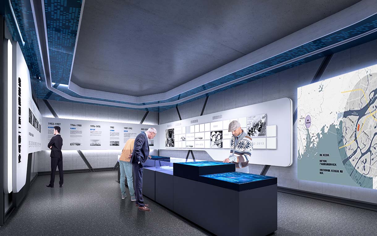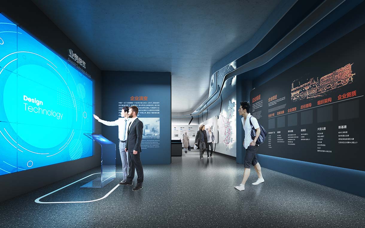 展陳形式上物理形式和多媒體互動形式相結合,空間色調上逐步提亮,并延續頂部鐵軌造型,代表著企業精神的延續。企業未來發展展區以三折幕的方式,打造沉浸式體驗空間,結合主題影片,展示企業未來發展的宏偉藍圖。