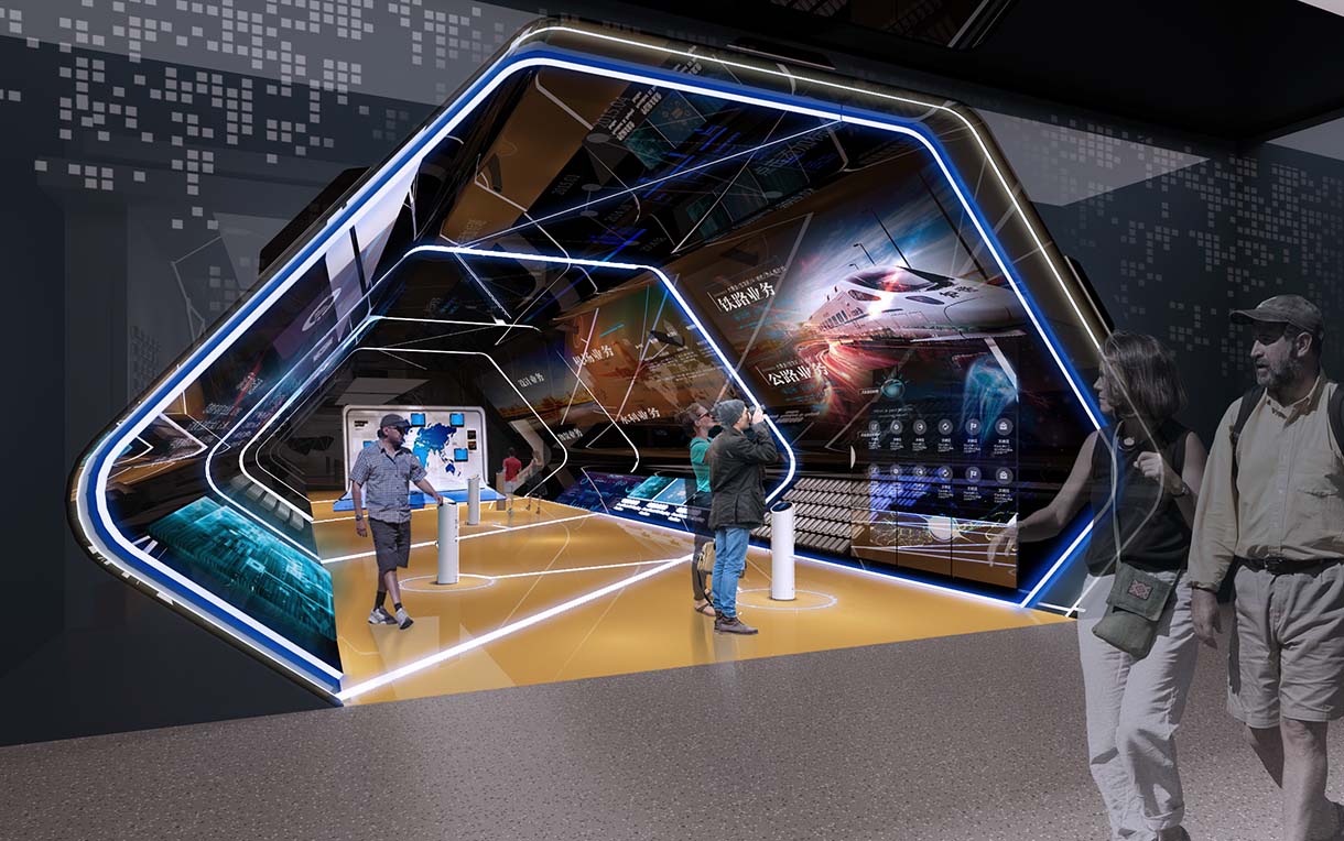 展廳設計策劃思路:以車站造型打造序廳整體空間氛圍,第一主展區延續序廳灰色色調,墻面穿插鐵軌元素,展示企業特質,并將鐵軌元素演化為頂部造型,貫穿全廳。核心業務展區結合頂部鐵軌元素,以火車穿越隧洞的意象打造空間形式感。