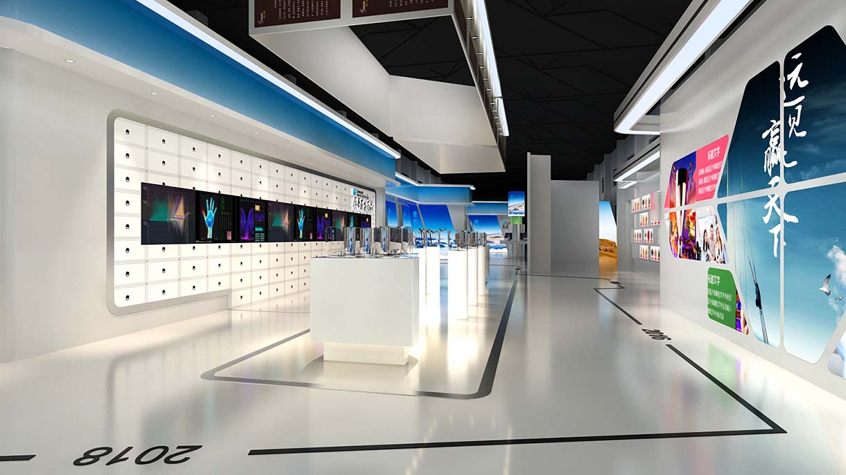本次設計采用led屏及大型異形led屏為主要展示裝置,使設備與空間完美融合,營造出合理立體的展示效果,給人以科技感,使客戶更沉浸其中,達到信息傳遞目的。