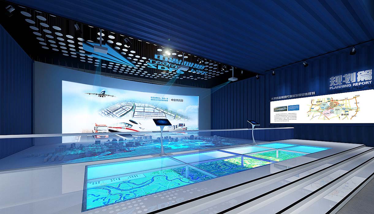 走過規劃篇,入眼就是巨大的數字沙盤展示區,設計師希望能通過巨大的造型及獨特的展示手法吸引客戶,通過數字化手段展示中鼎物流的未來規劃,同時配合整個展廳中多塊LED屏展示,營造科技感,加強整體展示效果。