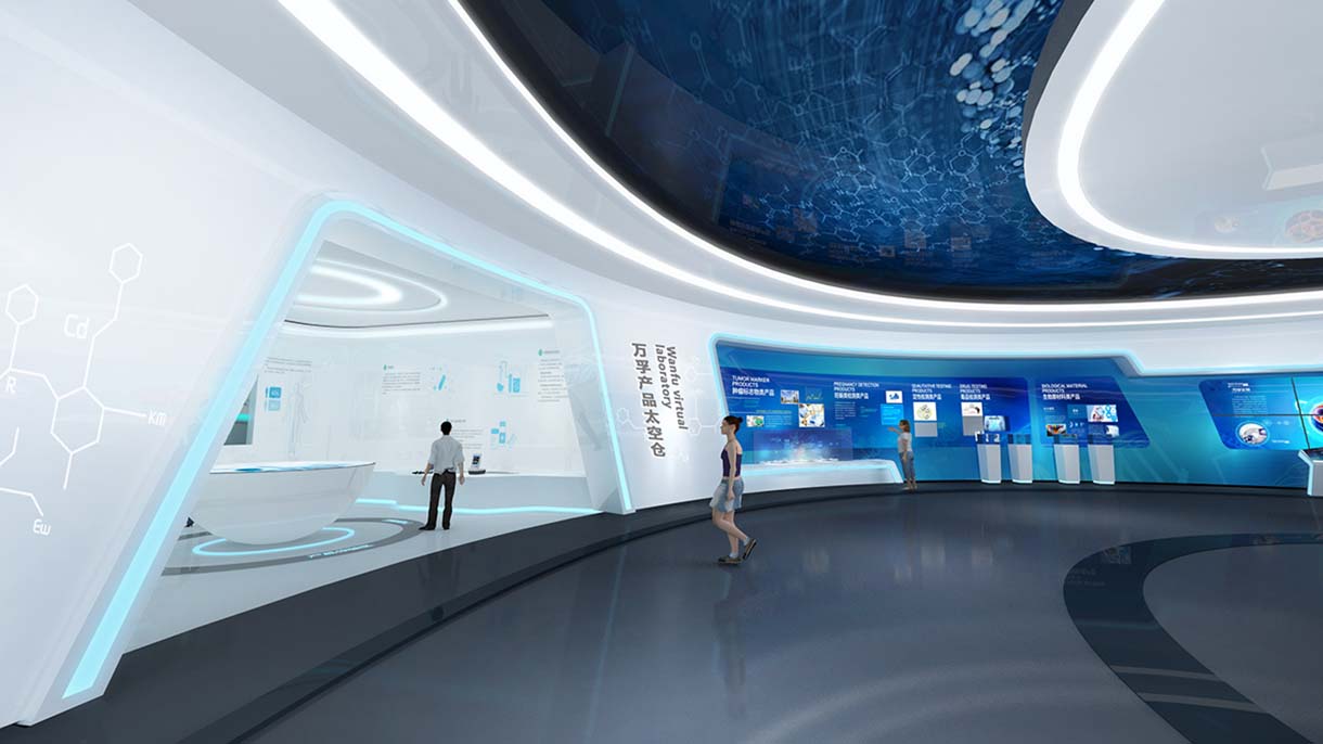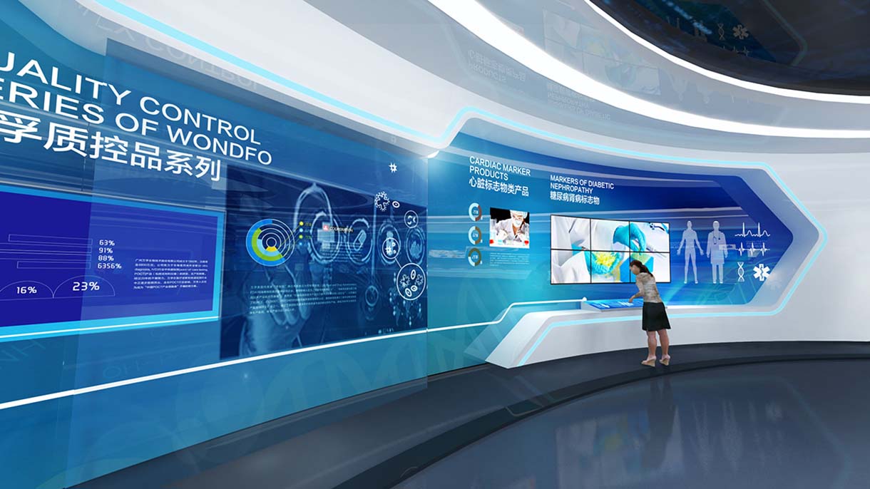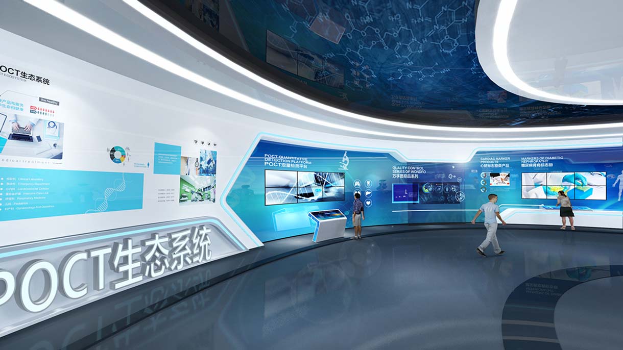展廳設(shè)計策劃思路:萬孚生物企業(yè)科技展廳整體設(shè)計以白藍(lán)色為主,注重展廳的流通性,整體氛圍活躍靈動,在設(shè)計中充分利用空間突顯產(chǎn)品的特色和品質(zhì),讓人印象深刻。