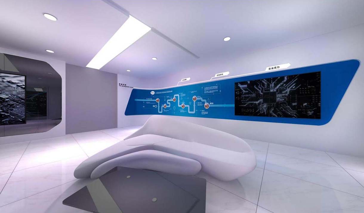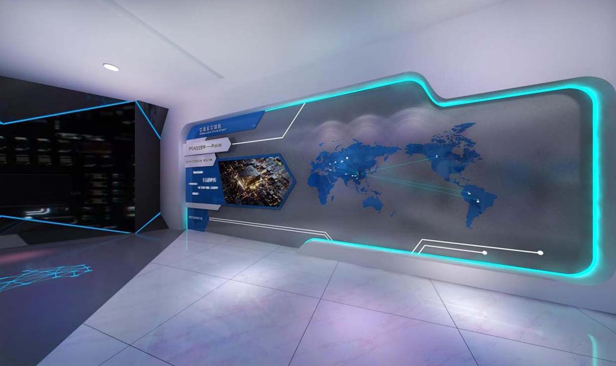 本項目將從企業大事記、初心與使命、中國芯中國夢為主線,全方位展現上海復旦微電子集團深厚的企業文化,提取芯片元素,采用黑色與藍色的碰撞,構造出科技、創新的上海復旦微電子企業文化展廳。